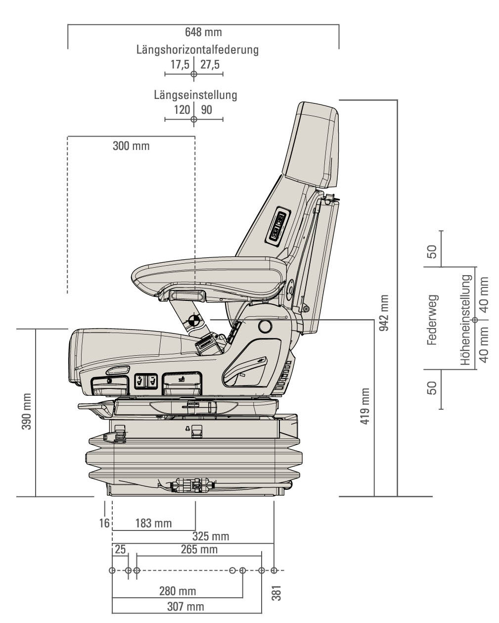 - Höheneinstellung stufenlos 80 mm (pneum.)